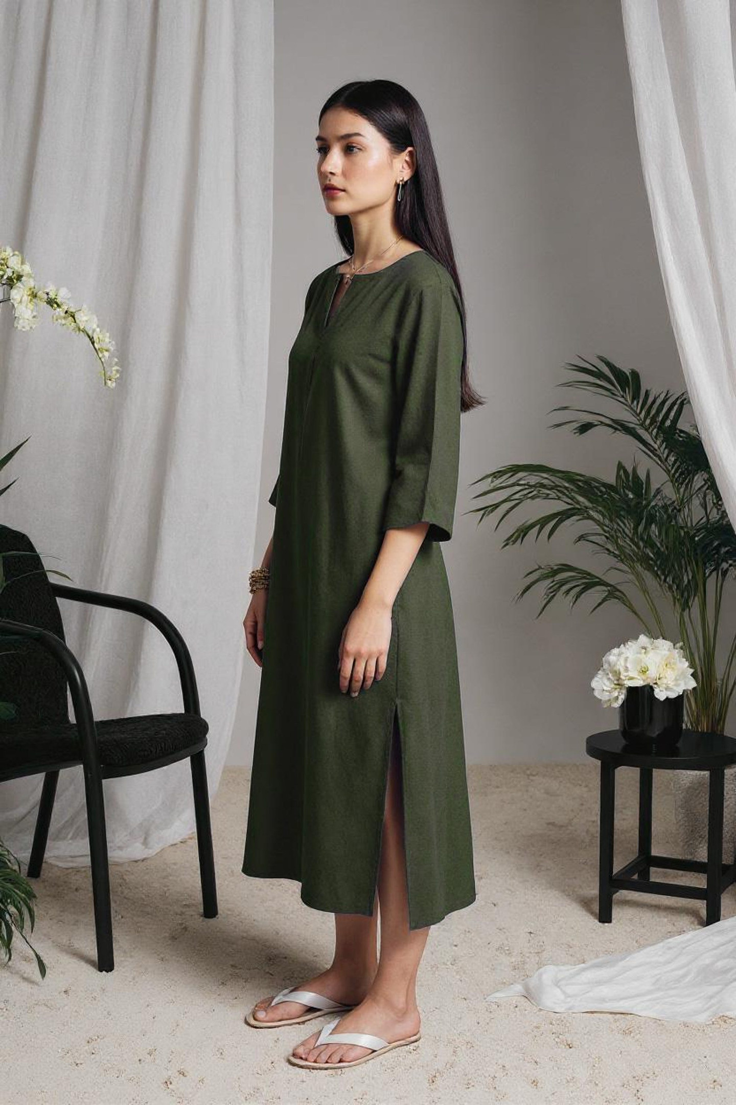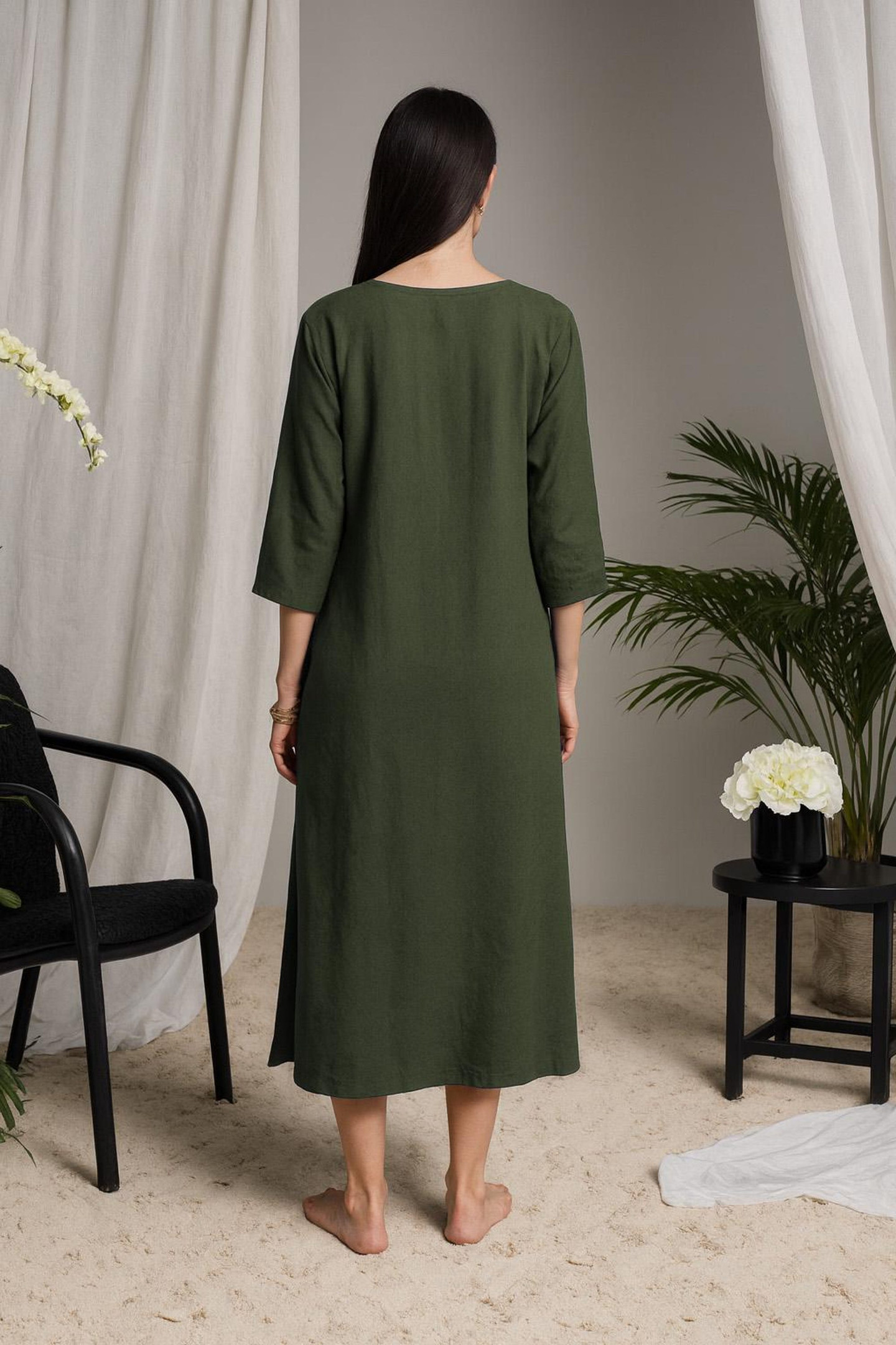 Model (172 cm, size S) wears the dress in OLIVE GREEN – choose your favorite shade from the dropdown menu